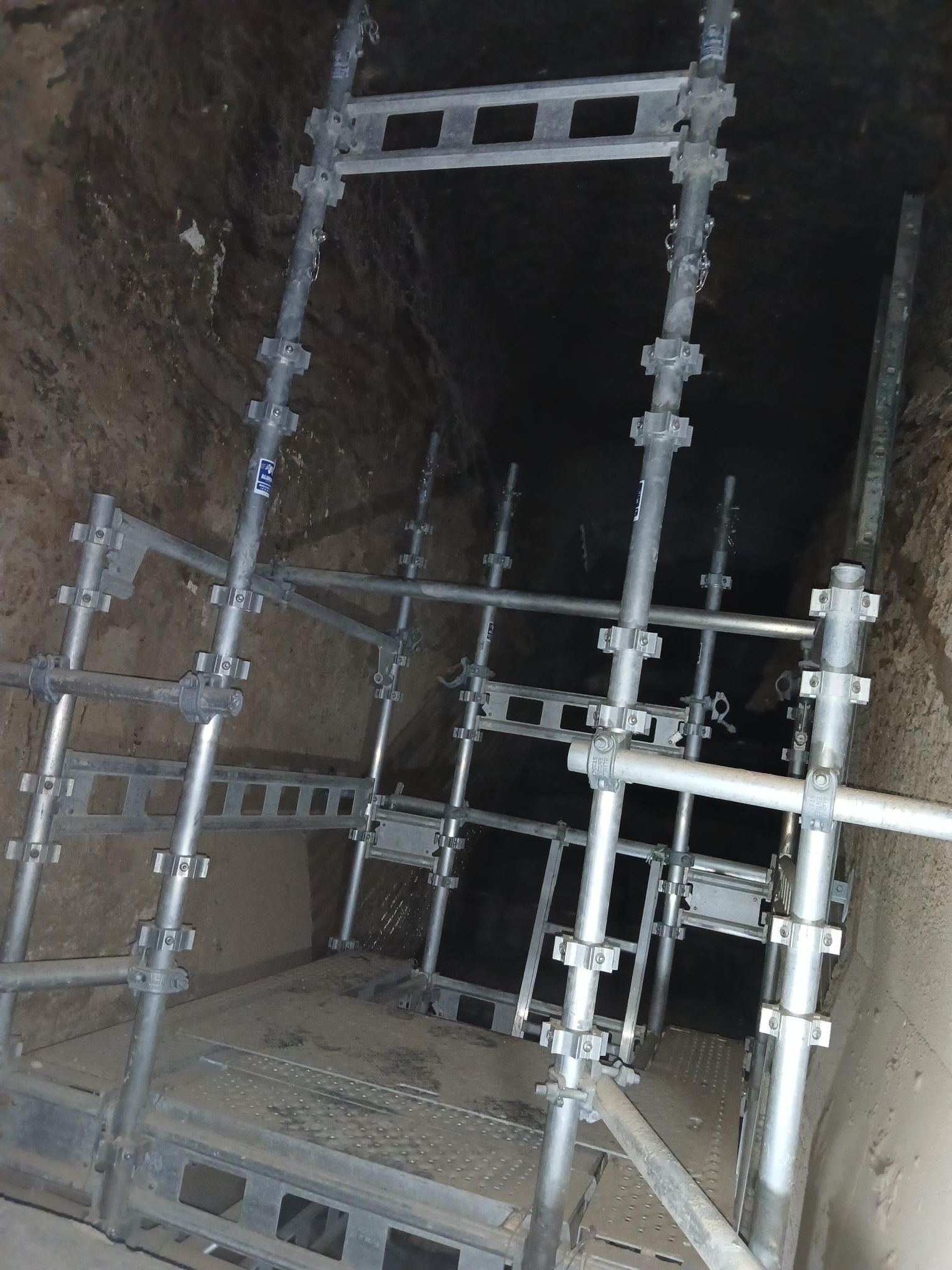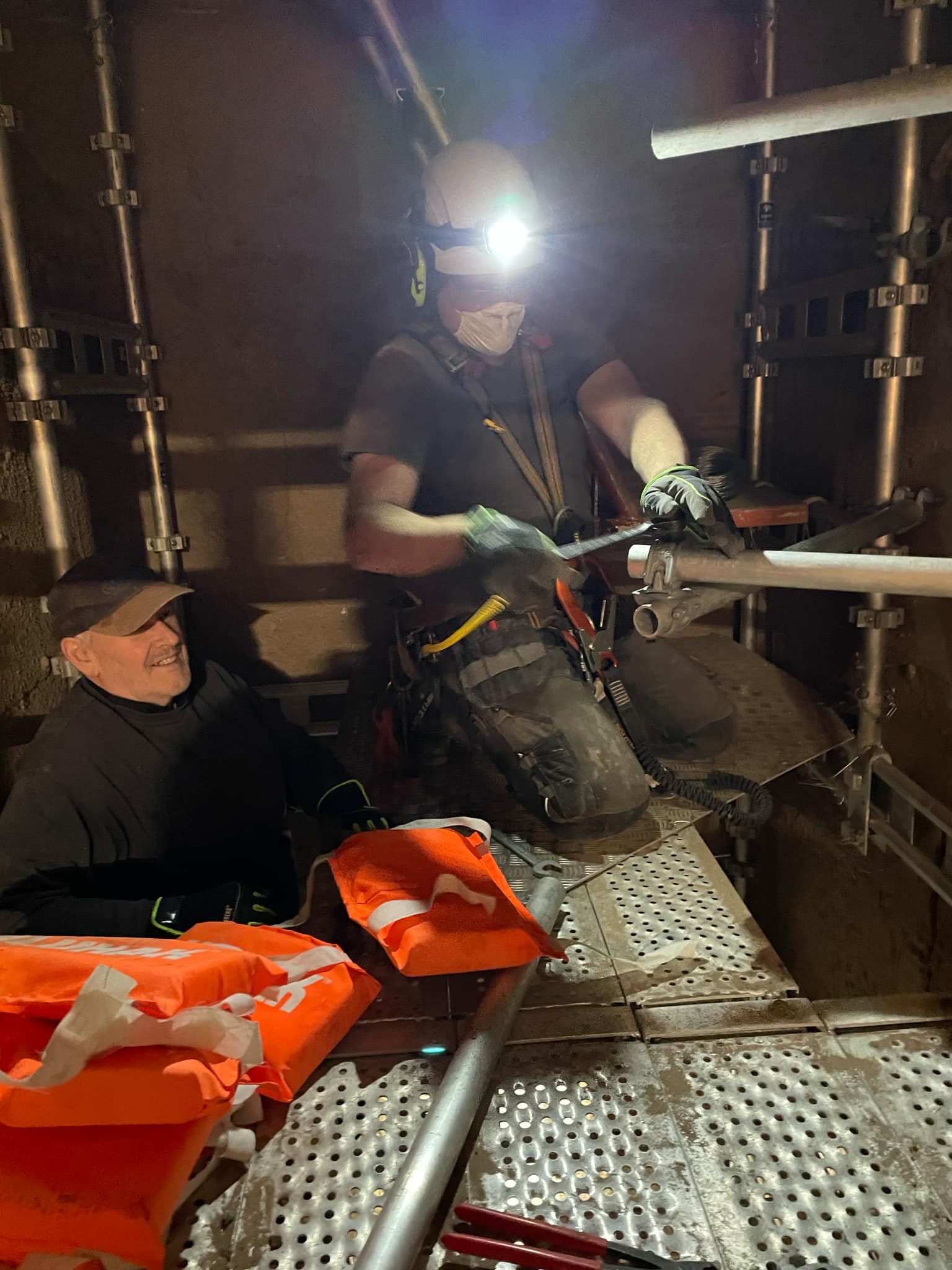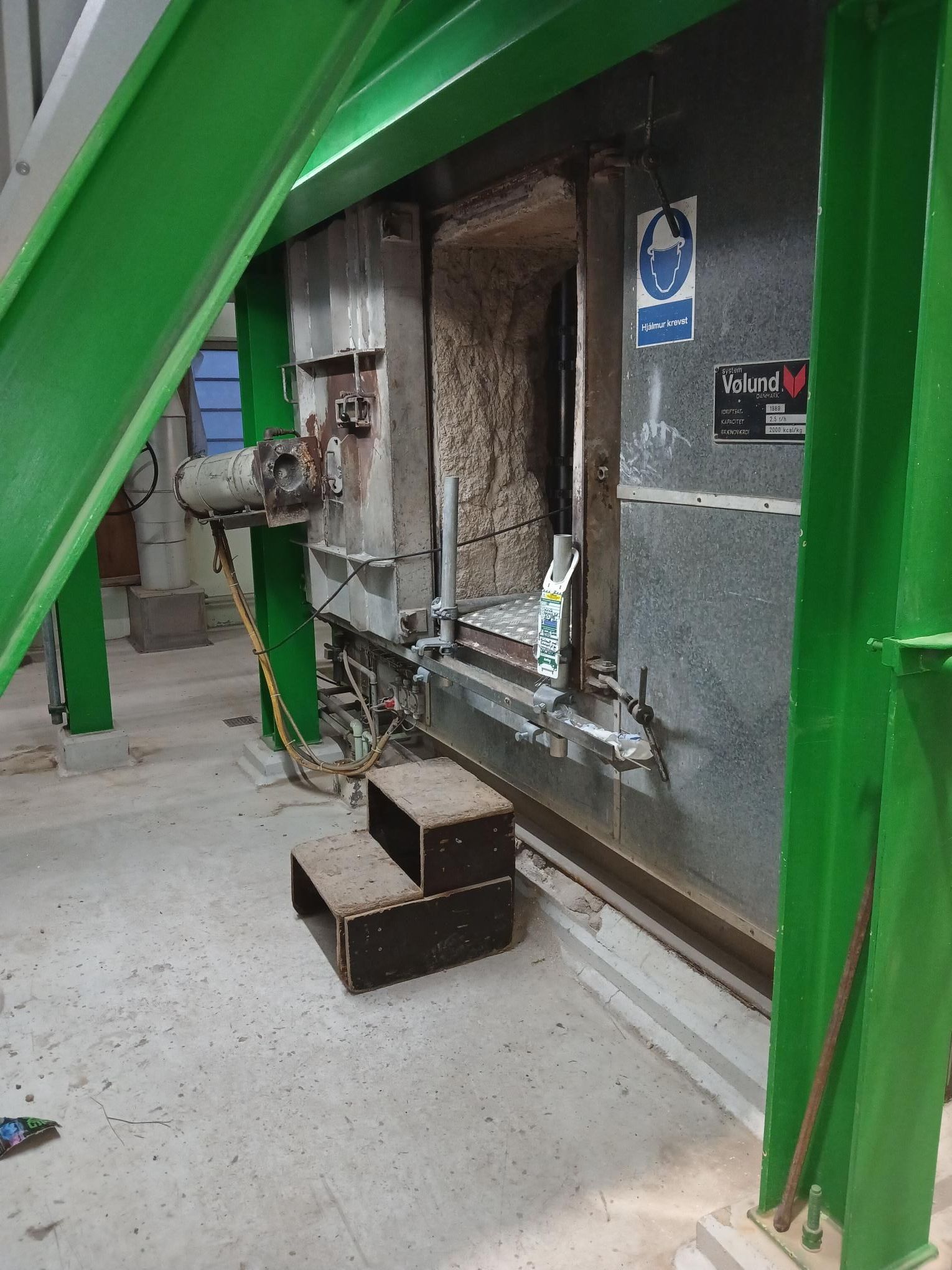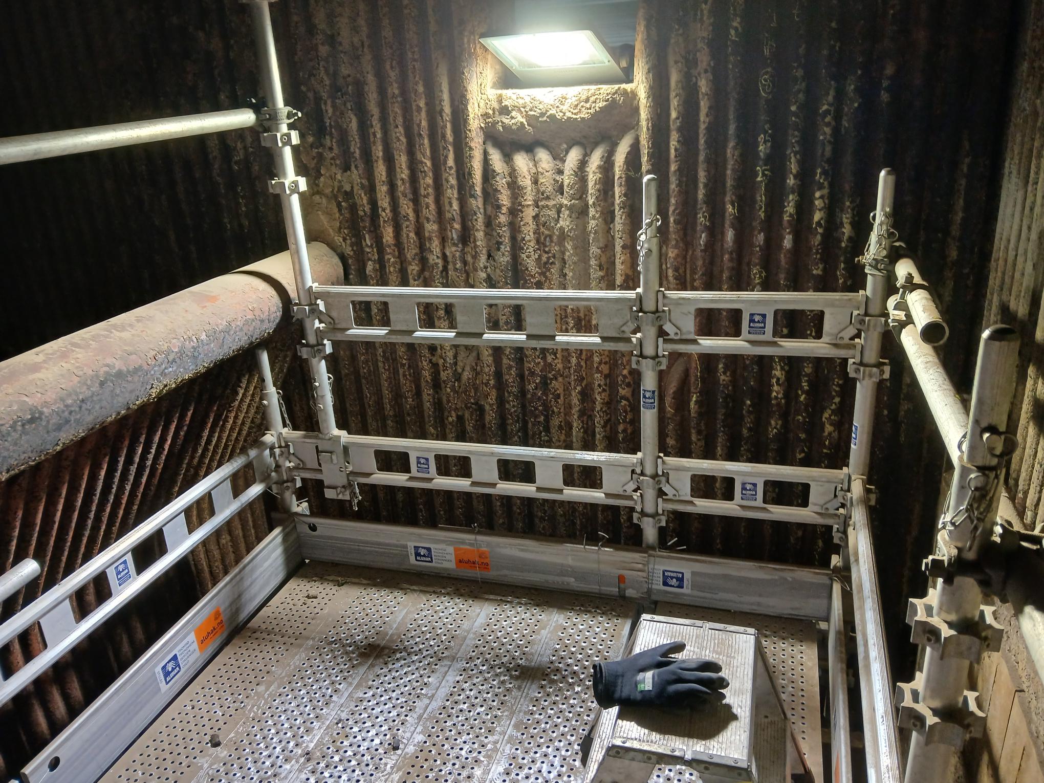 Uppsetan av stillas inni í ovninum á brennistøðini á Hjalla og hjá IRF í Leirvík.