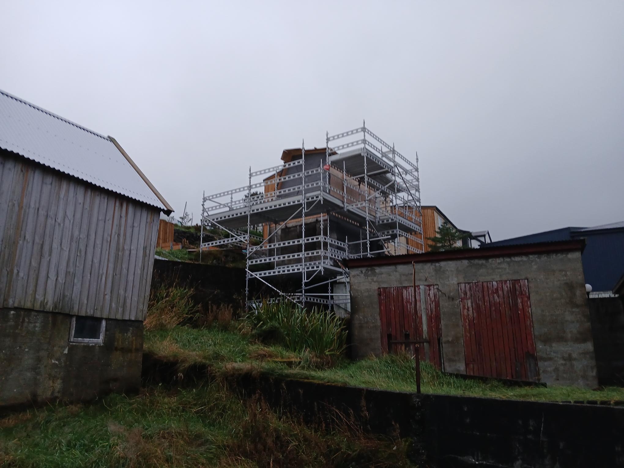 Uppsetan av stillas til eitt pussi arbeiði. Her var gjørligt at hava eina góða loysn runt um útbyggningin mitt á vegginum.