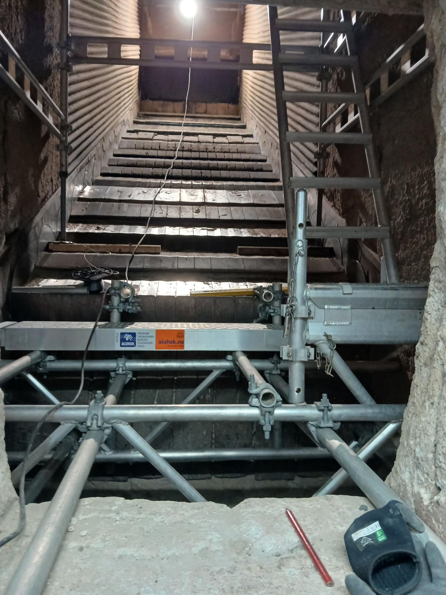 Í samband við takarbeiði bleiv tað set upp frítstandandi stillas á 10m hædd. Stillasi mátti ikki setast fast í veggin og hevur tí eitt stuðulstorn allan vegin. Gólvbreiddin í erva er 2,11 m. Hetta fyri at tað skuldi verða gjørligt at landa alt tilfar har uppi við kranabili.