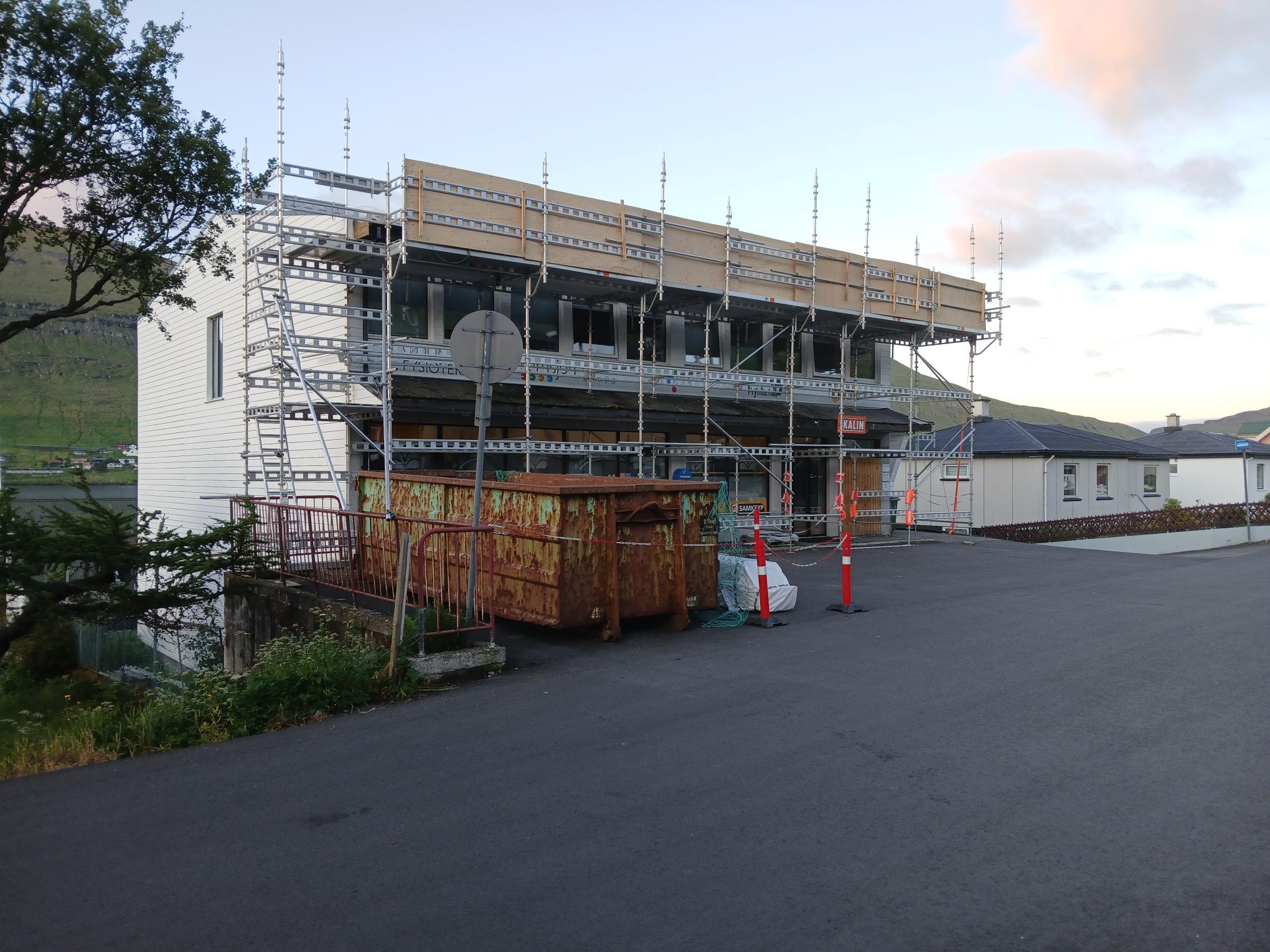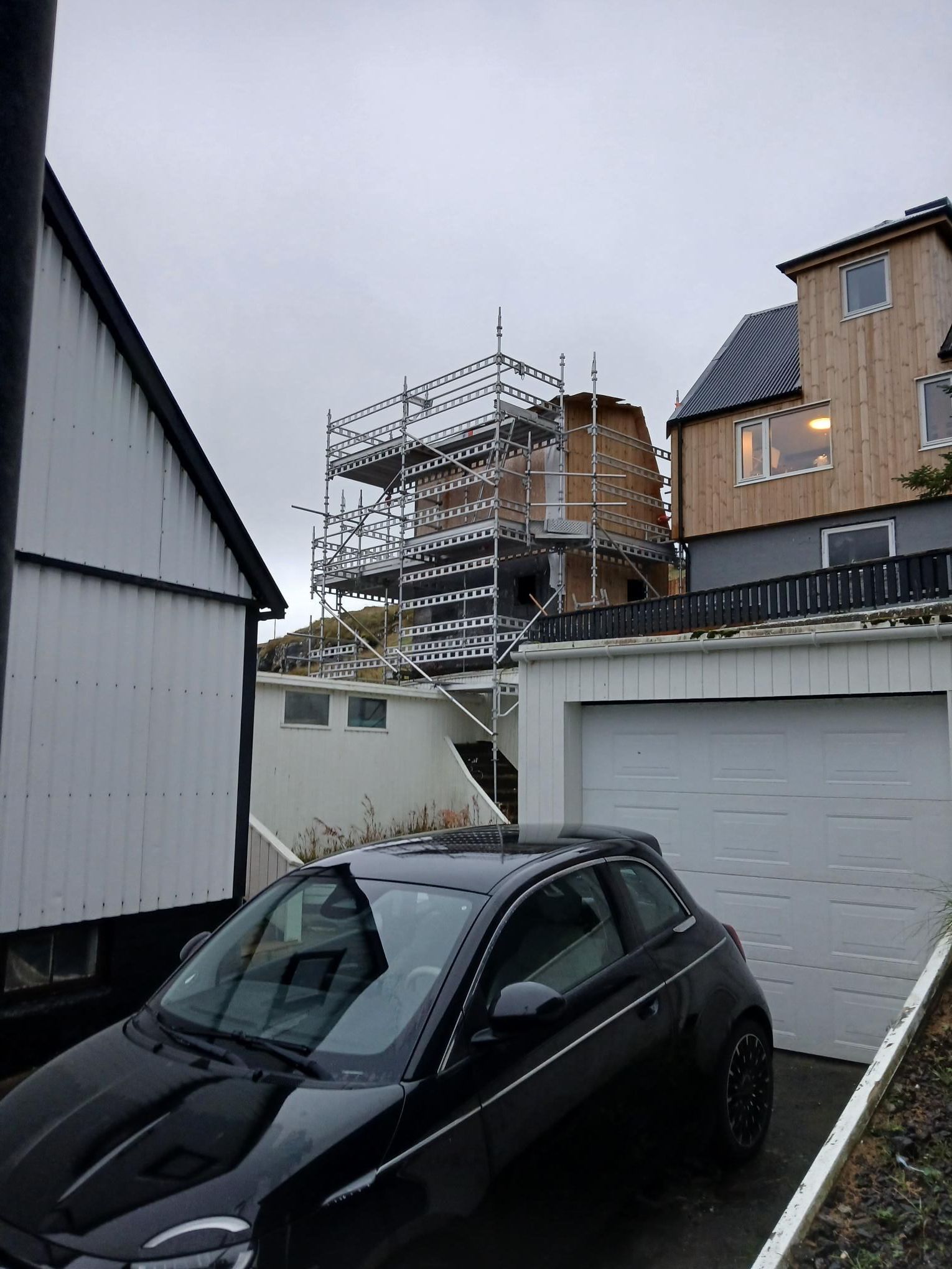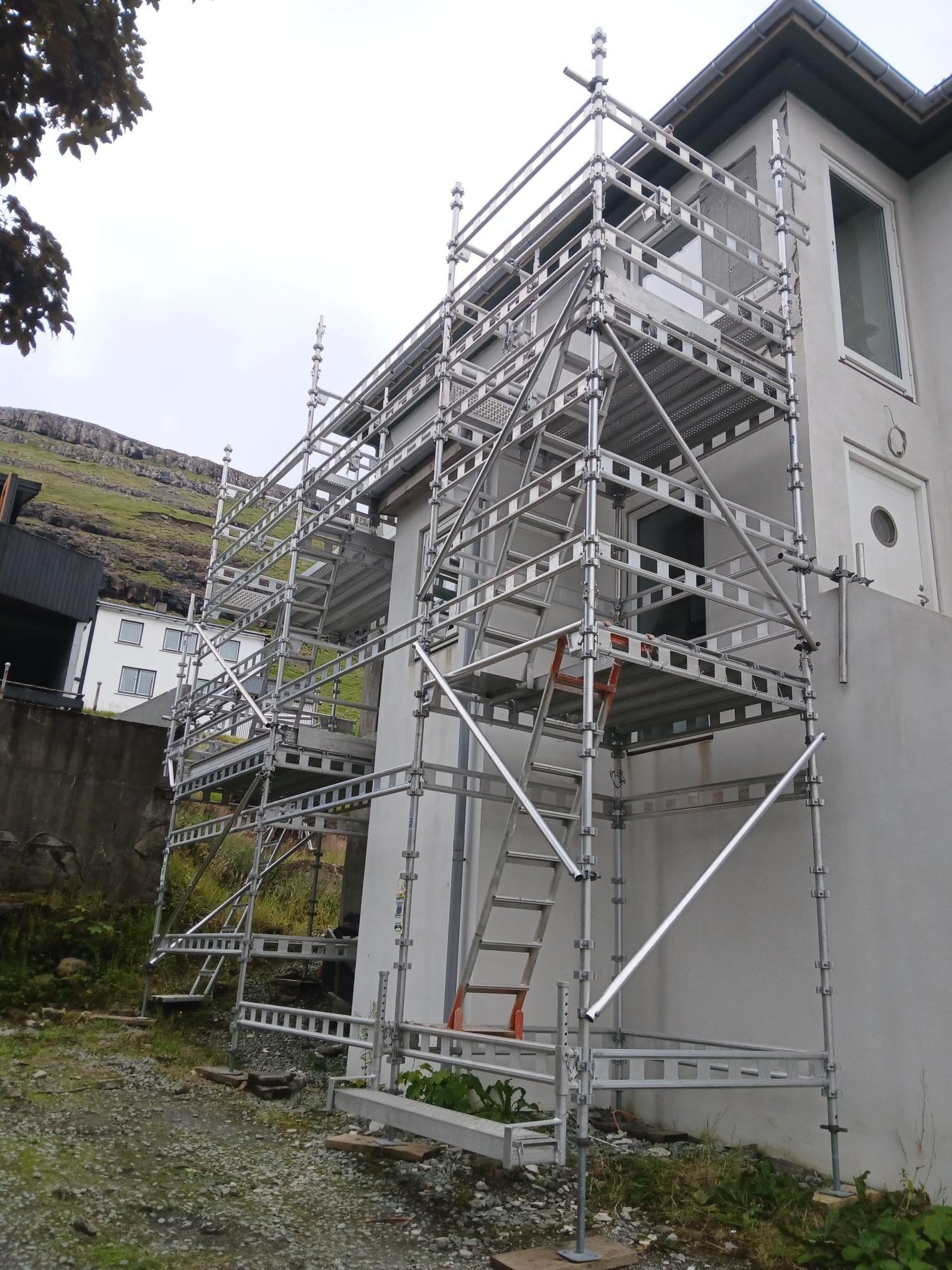 Uppsetan av stillas til eitt pussi arbeiði. Her var gjørligt at hava eina góða loysn runt um útbyggningin mitt á vegginum.